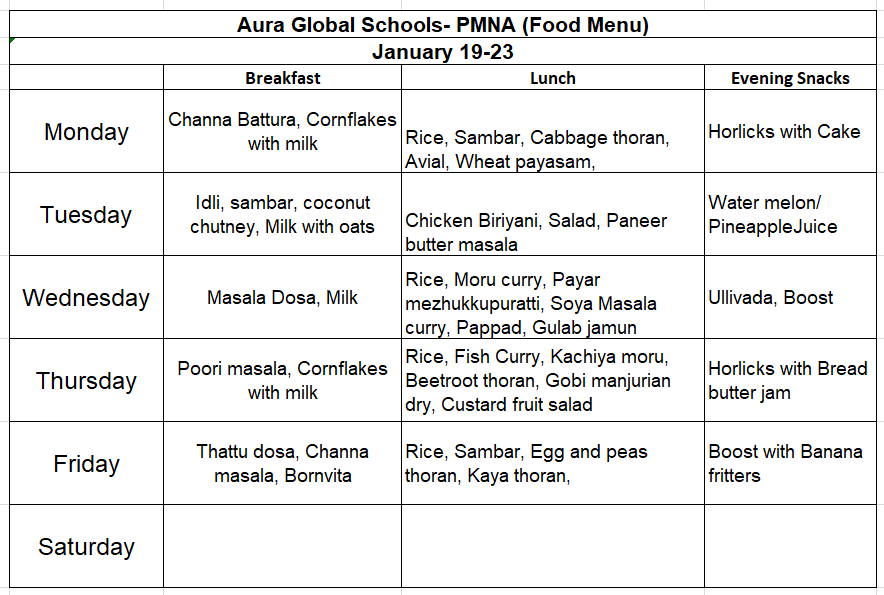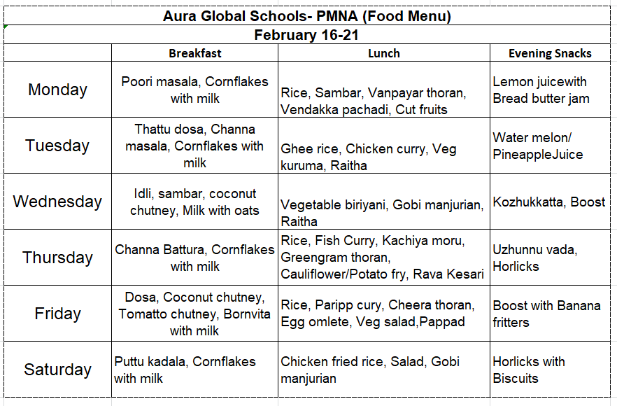 A balanced and nutritious diet is crucial for a child's growth. The school promotes healthy eating habits, ensuring students maintain a healthy mind and body. The weekly menu, designed with a dietitian, offers a nutritious variety, exposing students to different cuisines. The school provides hot vegetarian and non-vegetarian breakfast and lunch, along with evening snacks.